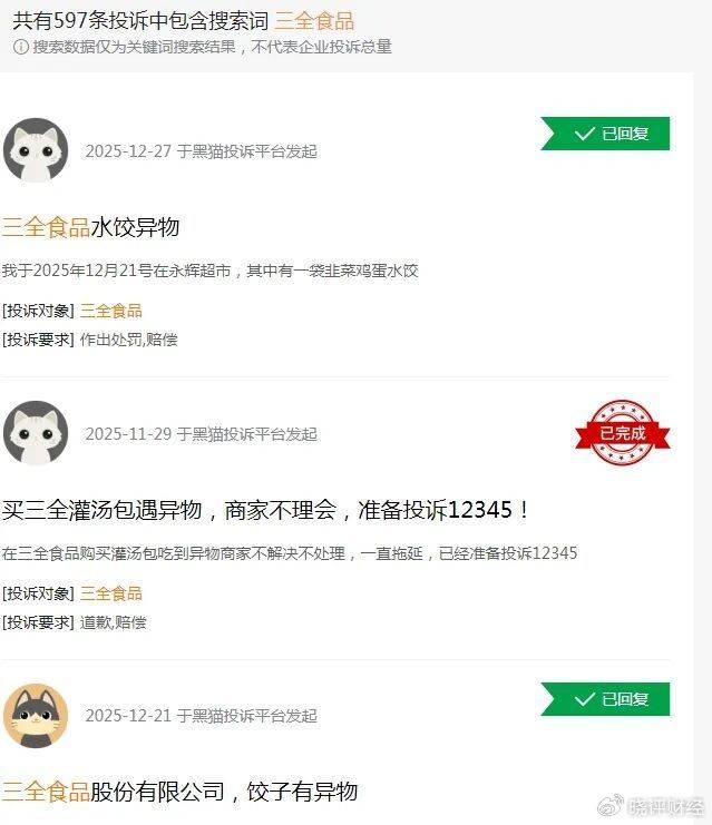 别的,食物平安问题的频发,进一步品牌价值。搜刮黑猫赞扬平台,目前已有597条赞扬,次要集中正在速冻水饺含异物、汤圆馅料变质和包拆破损等问题。